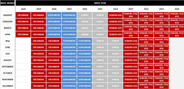 Please use the below chart to determine what league your child can play in. The box that indicated what league they should play is is determined by the year and month of your child’s birthday. For example, if a child was born in October of 2014, they are able to play in the Junior League. Any child born outside of the boundaries of this chart is not eligible to play SBMSA Basketball.